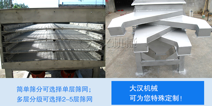 同時(shí)在篩網(wǎng)的安裝上也有多種選擇,簡(jiǎn)單篩分可選擇單層篩網(wǎng);多層分級(jí)可選擇2-5層篩網(wǎng),至于篩分比例(篩上物和篩下物)和現(xiàn)場(chǎng)空間的大小也可以直接和我們聯(lián)系,根據(jù)您的要求來(lái)為您特殊定制!